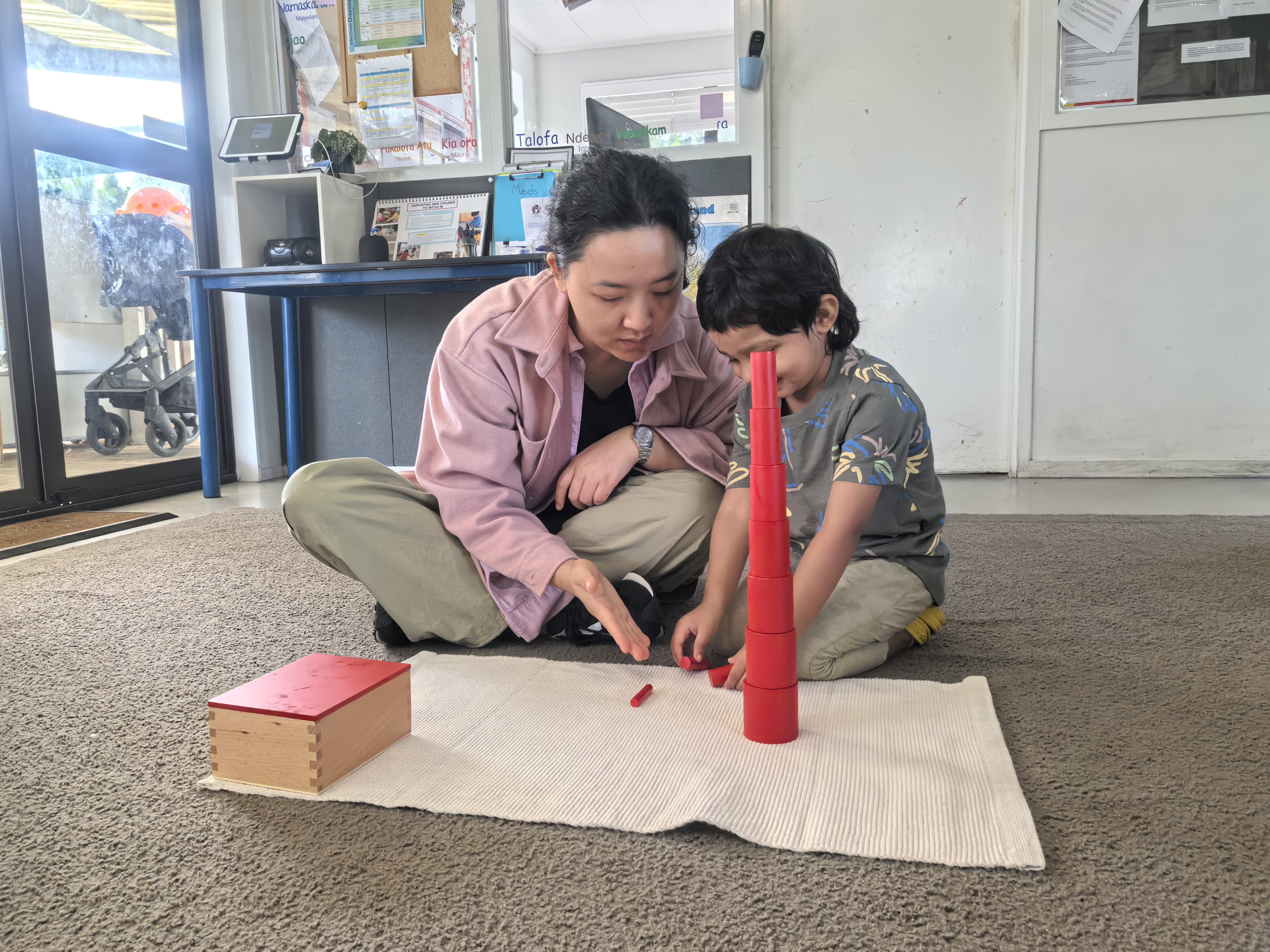 - Materials: Pink tower, color tablets, sound cylinders, geometric solids, and tactile boards.